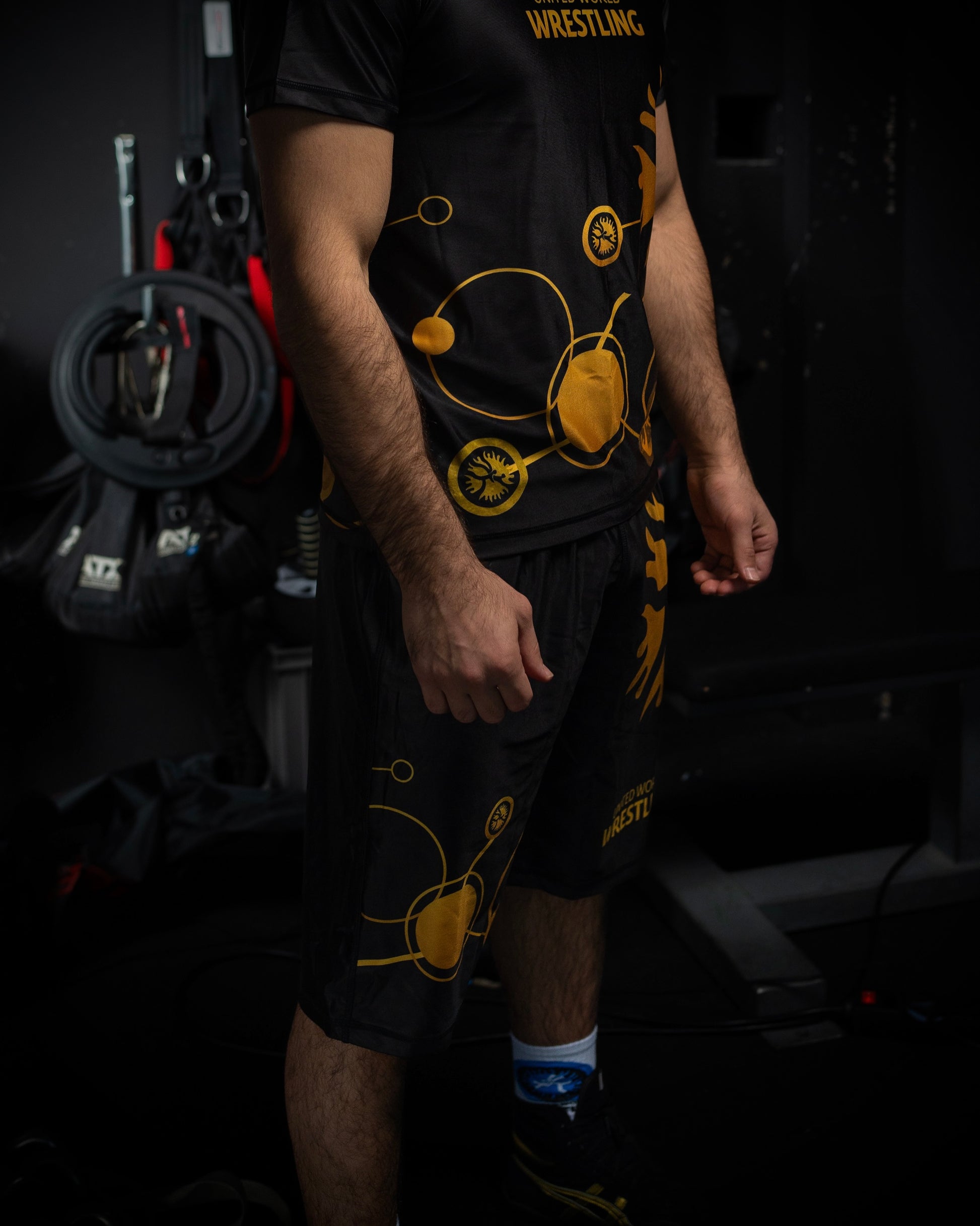 CRAFTED FROM 100% 3D LYCRA, BOTH PIECES OFFER UNRIVALED FLEXIBILITY, DURABILITY, AND A CONTOURED FIT DESIGNED FOR HIGH-PERFORMANCE TRAINING AND STREET-READY PRESENCE. THE DEEP BLACK BASE IS STRIKINGLY ACCENTED WITH GOLD DETAILS, A SYMBOL OF ELITE STRENGTH AND UNCOMPROMISING AMBITION.