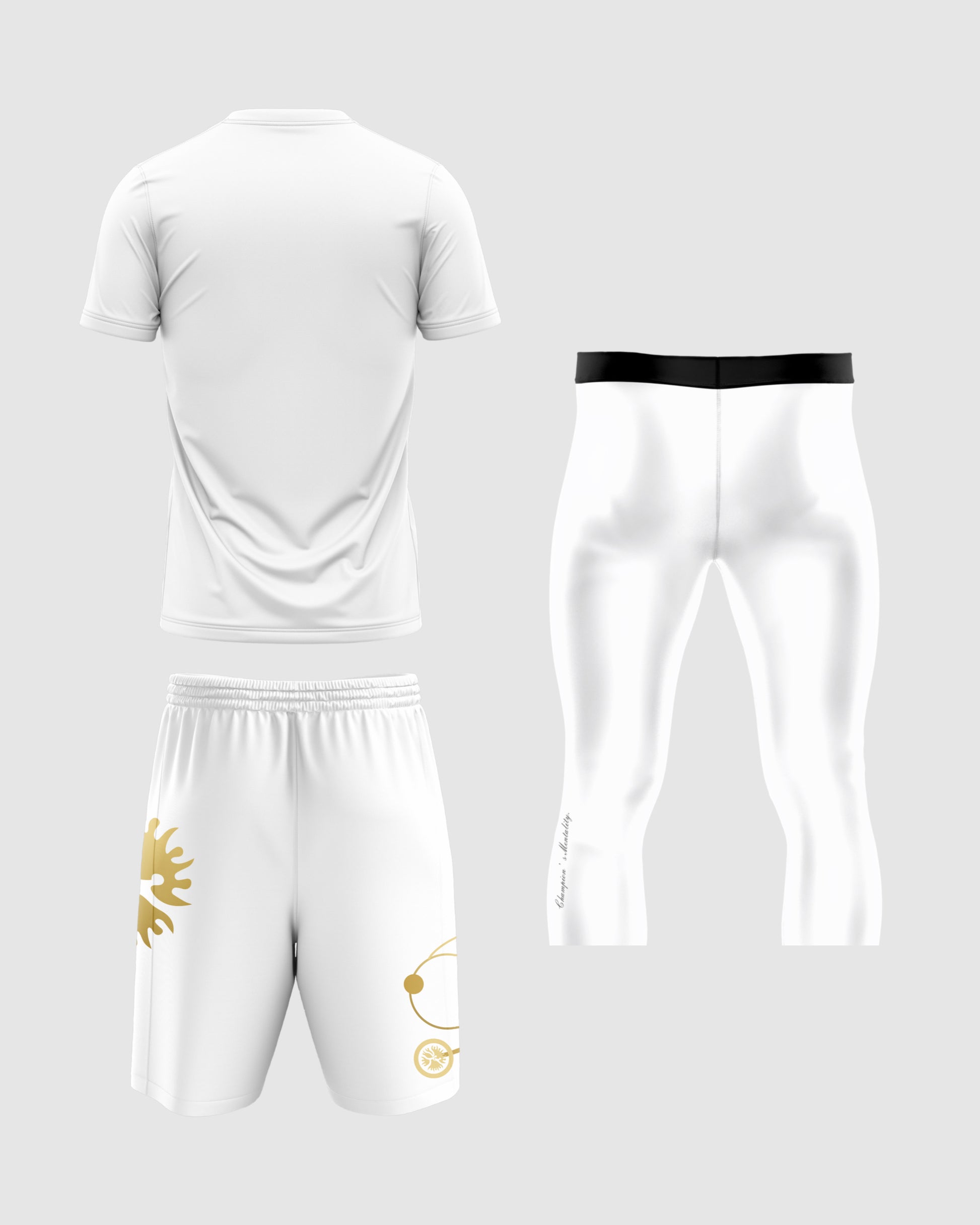 THE WHITE & GOLD T-SHIRT AND MATCHING PERFORMANCE SHORTS ARE ELEVATED BY THE ADDITION OF 3/4 WHITE TRAINING LEGGINGS, DELIVERING ENHANCED SUPPORT, STREAMLINED MUSCLE COMPRESSION, AND A SHARP, LAYERED LOOK BUILT FOR BOTH GYM DOMINANCE AND STREET PRESENCE. THE CLEAN WHITE BASE, ACCENTED WITH STRIKING GOLD DETAILS, SYMBOLIZES DISCIPLINE, FOCUS, AND ELITE MENTALITY.